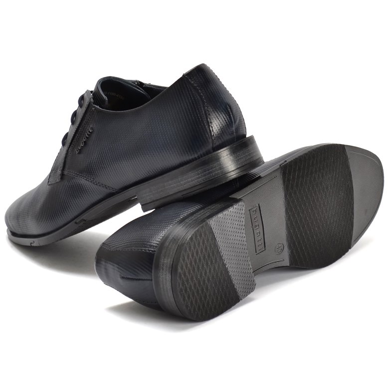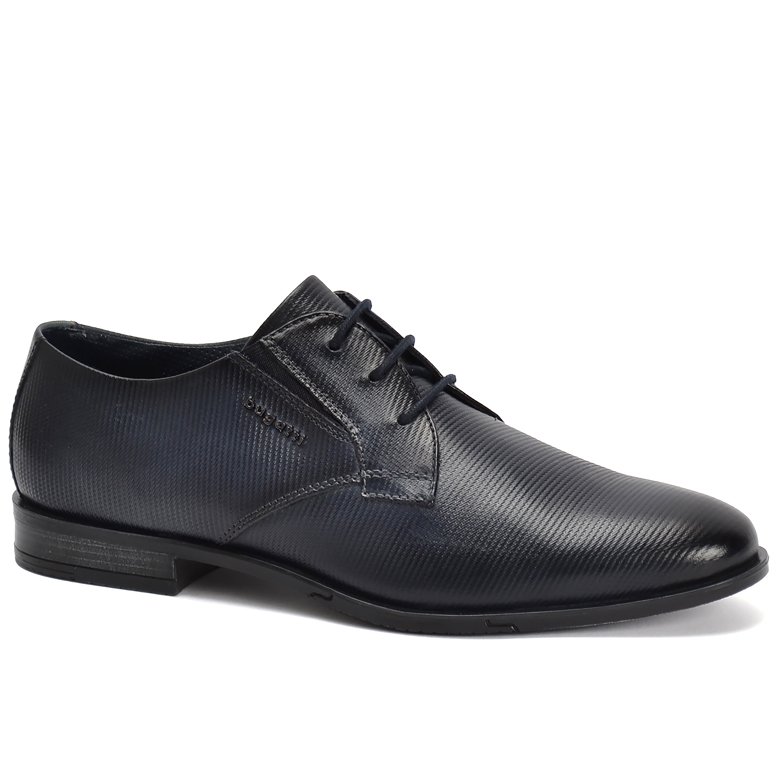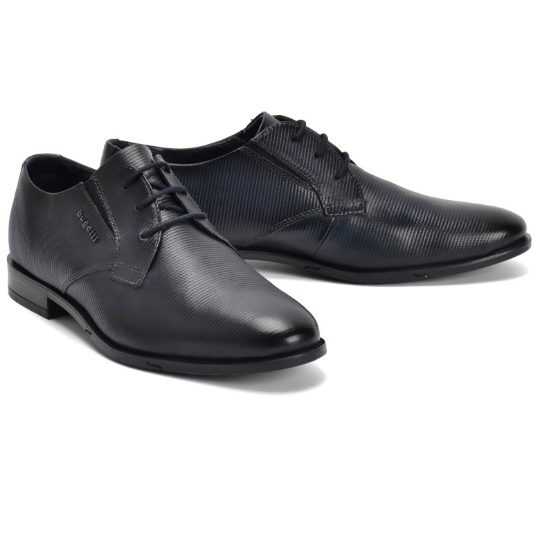 Smart leather derby 3 eyelet lace up shoe with hand burnished detail. Slimline rubber outsole with flex insert for good grip. Subtle elastic for greater comfort over the instep. Cushioned leather insole for added comfort when walking. Refined Bugatti logo is a finishing touch.