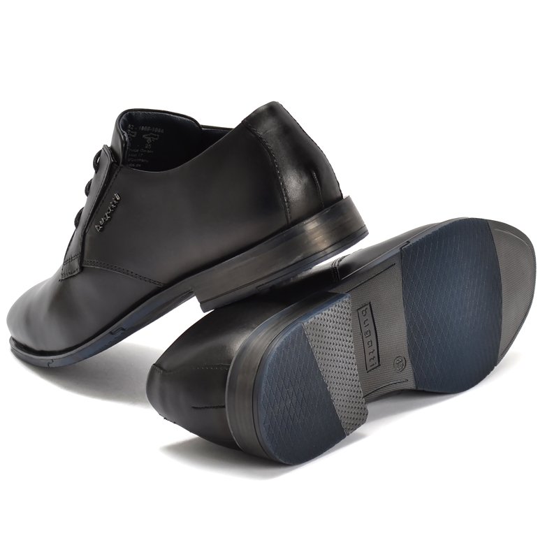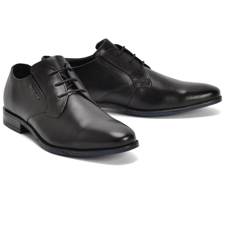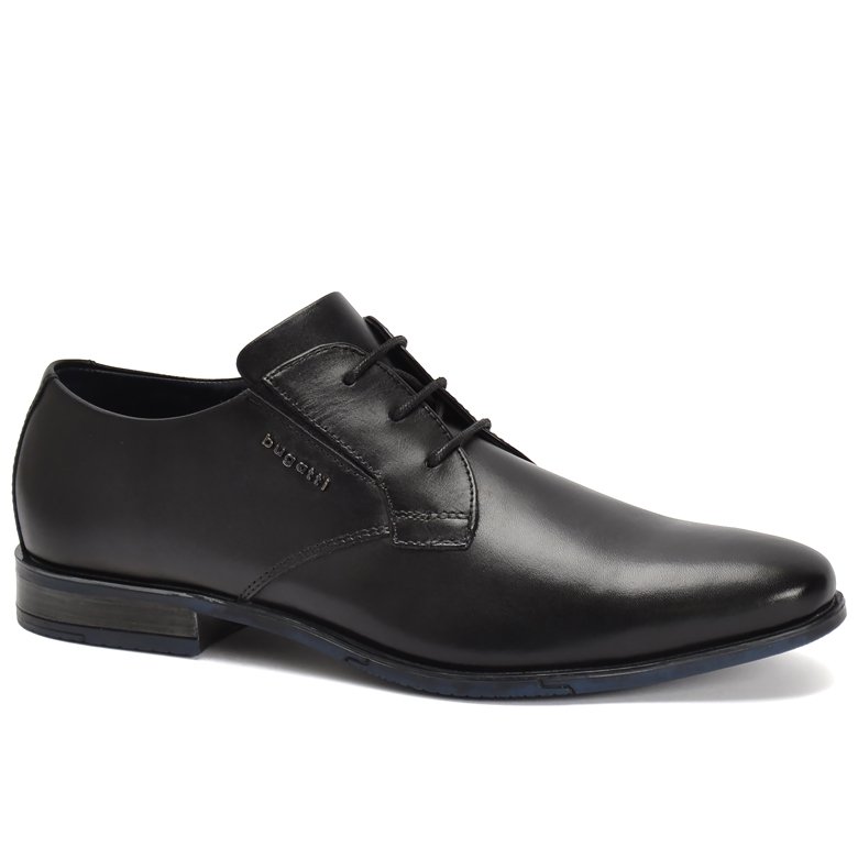 Smart leather derby 3 eyelet lace up shoe with slimline rubber outsole and flex insert for good grip. Subtle elastic for greater comfort over the instep. Cushioned leather insole for added comfort when walking. Refined Bugatti logo is a finishing touch.