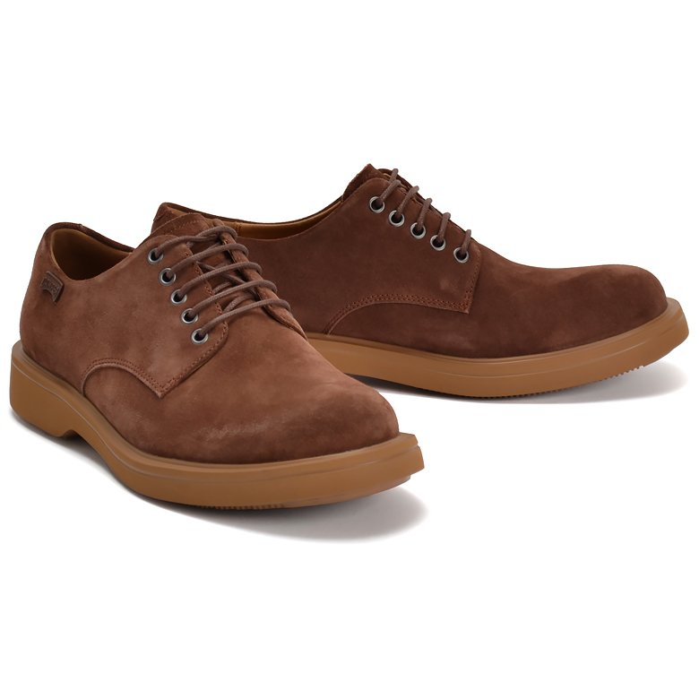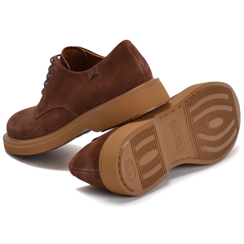 5 eyelet leather Camper NORMAN derby shoe with plain vamp in soft suede. Featuring lightweight yet durable XL ExtraLight® rubber sole to provide cushioning when walking and EVA outsoles. Textile lining for a breathable interior with a cushioned insole for walking.